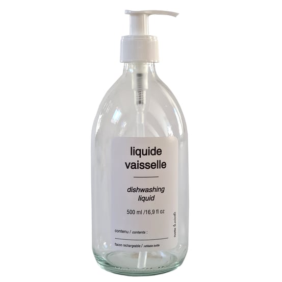 FLACON POMPE VIDE LIQUIDE VAISSELLE 500 ml verre transparent, étiquette "liquide