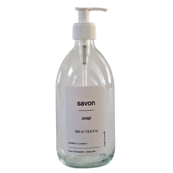 - FLACON POMPE VIDE SAVON 500 ml verre transparent, étiquette "savon", pompe blanche 2 ml, flacon 240 gr, hauteur 20,5 cm, Ø 7 cm